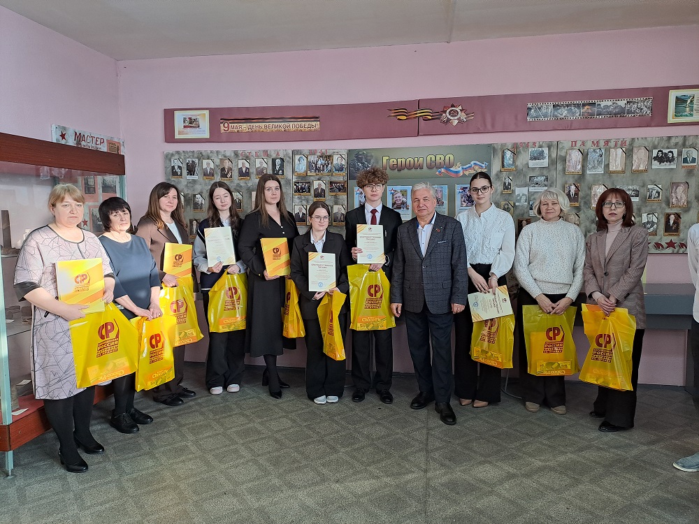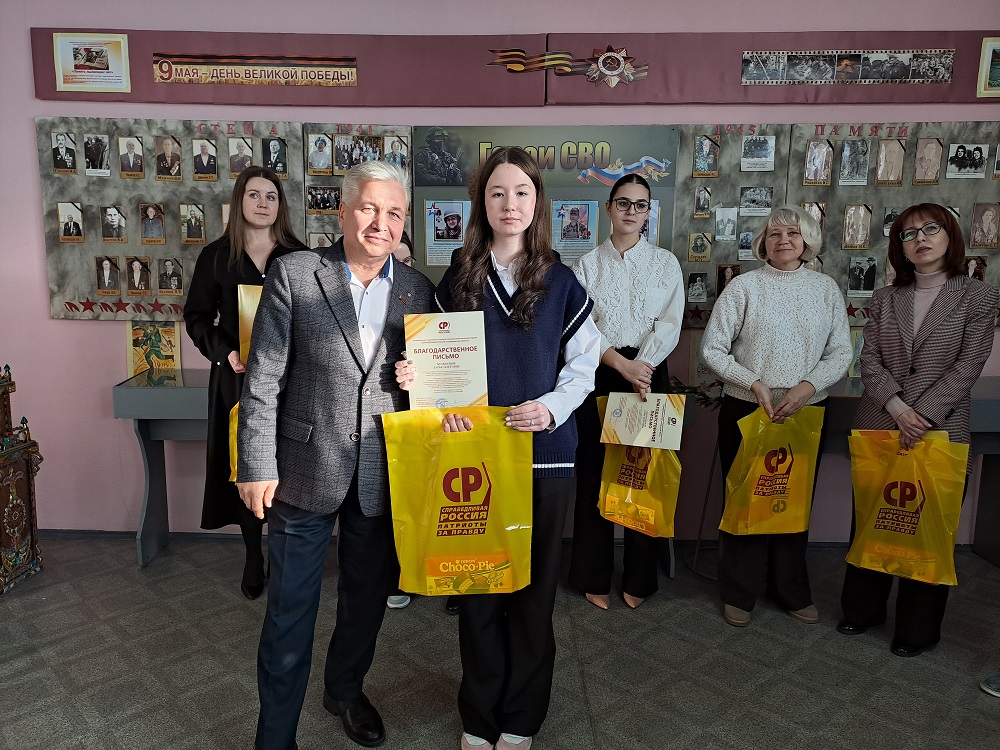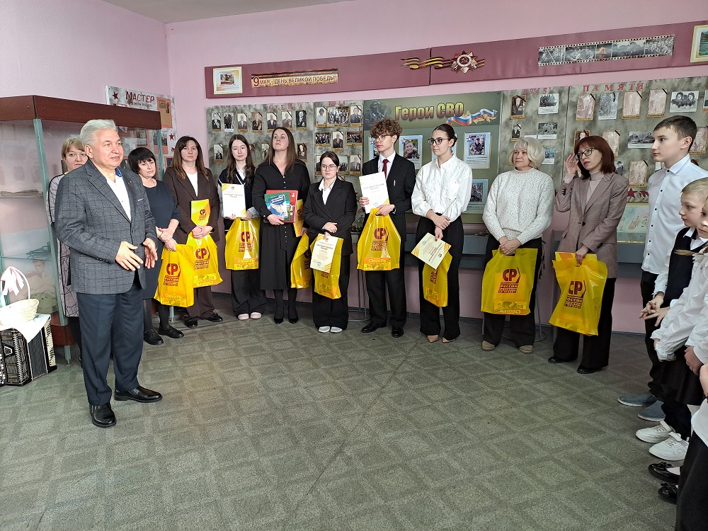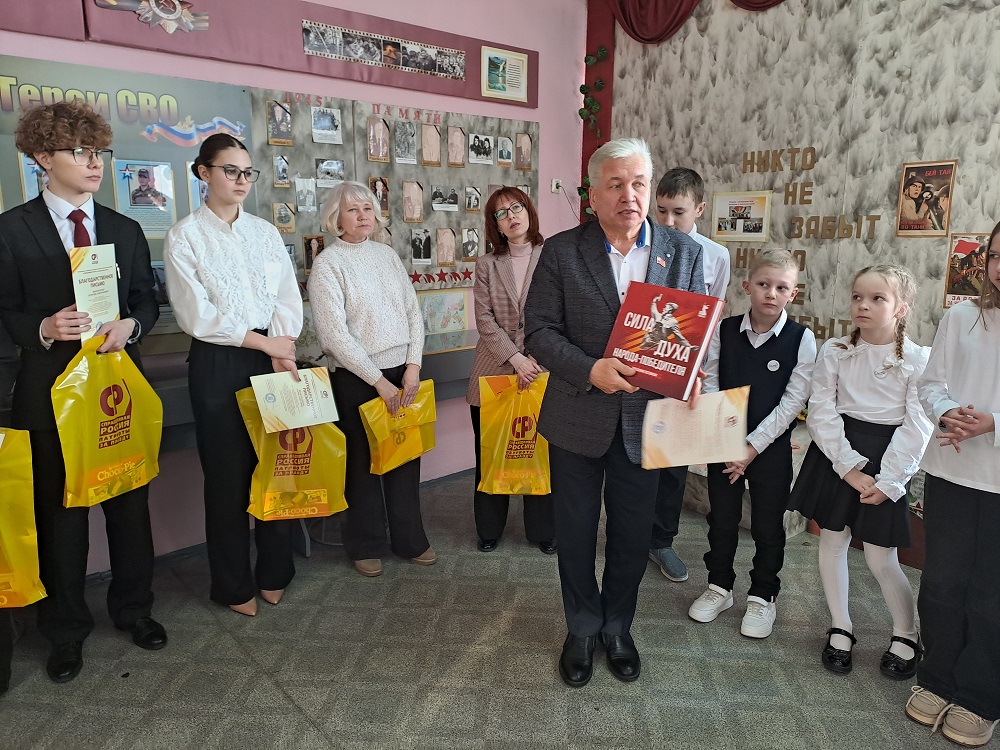 В знак благодарности школе был передан экземпляр книги памяти "Сила духа народа-победителя. Завещание потомкам". Это издание, выпущенное к 80-летию Победы по инициативе председателя партии СПРАВЕДЛИВАЯ РОССИЯ Сергея Миронова, представляет собой ценный архив историй о героях Великой Отечественной войны.