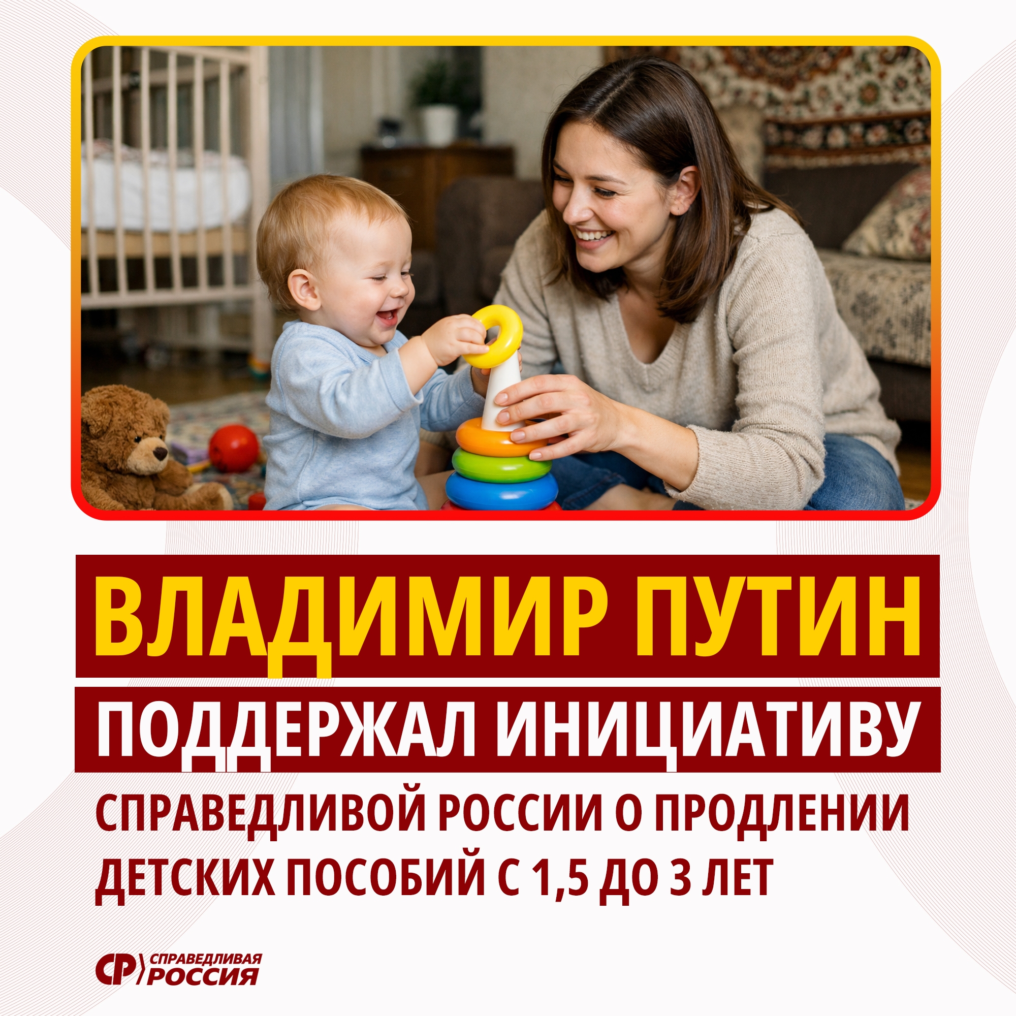 СПРАВЕДЛИВАЯ РОССИЯ достигла цели: Путин поручил продлить выплаты семьям детских пособий с полутора до трех лет! / Долгожданная новость для российских семей! Президент Владимир Путин дал поручение Правительству РФ рассмотреть вопрос о продлении выплаты детских пособий с полутора до трех лет. Это именно то, чего на протяжении многих лет добивалась партия СПРАВЕДЛИВАЯ РОССИЯ, неоднократно вносившая соответствующие законопроекты, последний из которых был представлен в середине февраля текущего года.