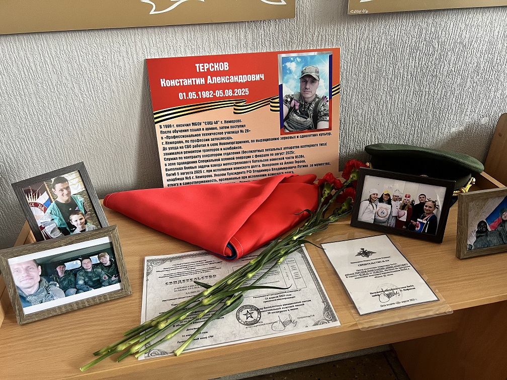 Заместитель председателя Парламента Кузбасса, председатель регионального отделения Социалистической партии "СПРАВЕДЛИВАЯ РОССИЯ – ПАТРИОТЫ – ЗА ПРАВДУ" в Кемеровской области Юрий Скворцов принял участие в открытии мемориальной экспозиции, посвящённой герою специальной военной операции, выпускнику средней общеобразовательной школы № 40 имени А.С. Катасонова города Кемерово – Терскову Константину Александровичу.