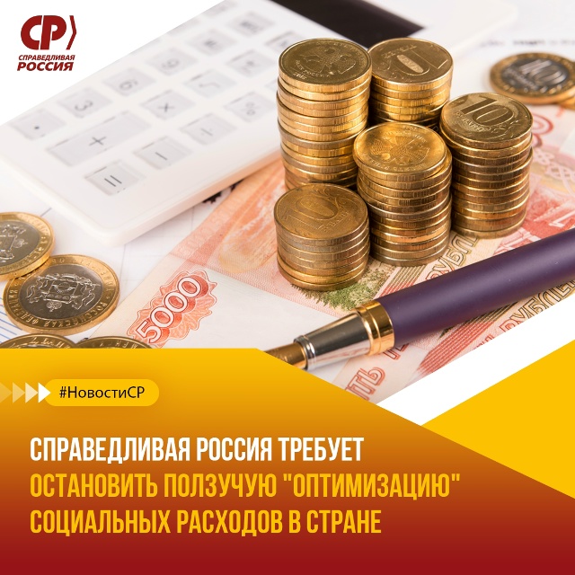 "Партия СПРАВЕДЛИВАЯ РОССИЯ требует остановить ползучую "оптимизацию" социальных расходов в стране. Для этого партия предлагает: ввести прямой запрет на сокращение социальных учреждений и зарплат работников. Ввести федеральные гарантии оплаты труда врачей, учителей и других специалистов, чтобы оклад составлял не менее 70% от зарплаты.
