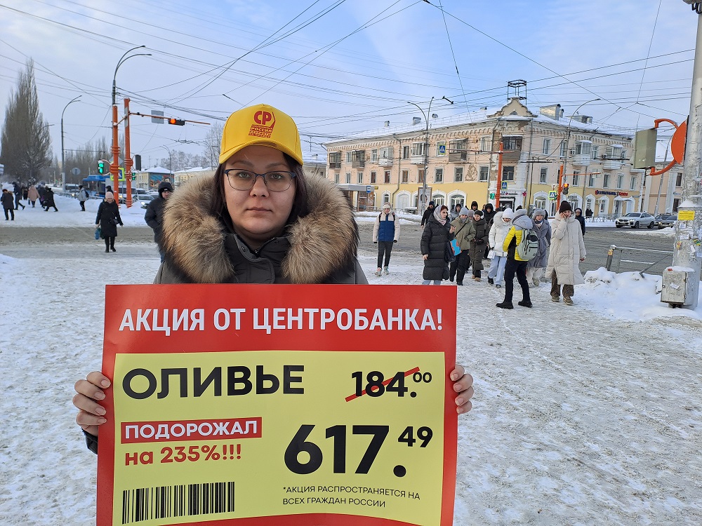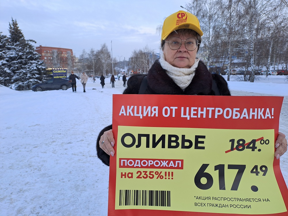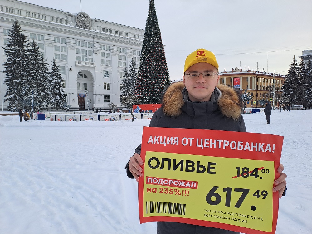 Активисты регионального отделения Социалистической партии СПРАВЕДЛИВАЯ РОССИЯ в Кемеровской области в рамках федерального проекта "СПРАВЕДЛИВАЯ РОССИЯ: РЕАЛЬНАЯ ЖИЗНЬ РЕАЛЬНЫХ ЛЮДЕЙ" по итогам мониторинга цен на продукты в торговых сетях для определения Индекса Оливье провели на оживленных улицах, общественном пространстве и у торгового центра одиночные пикеты.