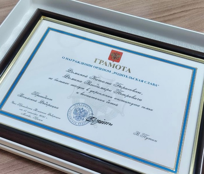 Указом Президента России Владимира Владимировича Путина многодетная семья из Юрги Фоминых Владимира Петровича и Натальи Борисовны награждена Орденом "Родительская слава" за большие заслуги в укреплении института семьи и воспитании детей.