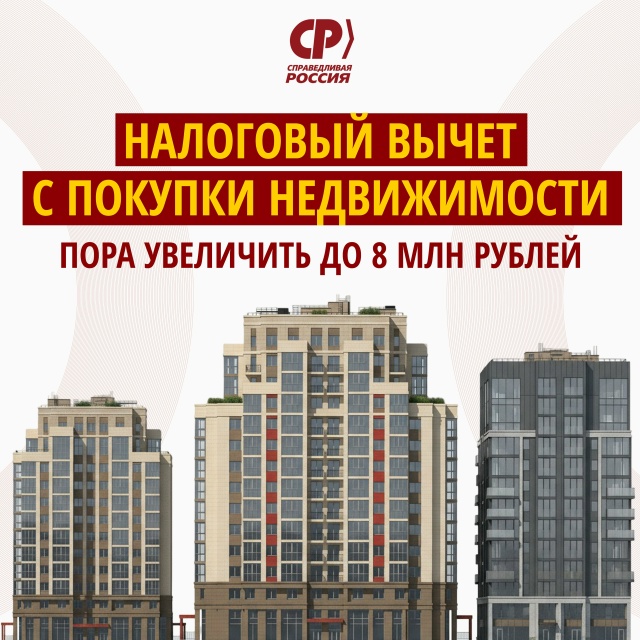 Партия СПРАВЕДЛИВАЯ РОССИЯ выступила с инициативой значительно увеличить налоговые вычеты, связанные с приобретением или строительством жилья. Речь идет о повышении максимальной суммы вычета с нынешних 2 миллионов рублей до 8 миллионов, а также увеличении лимита по ипотечным процентам с 3 до 6 миллионов рублей.