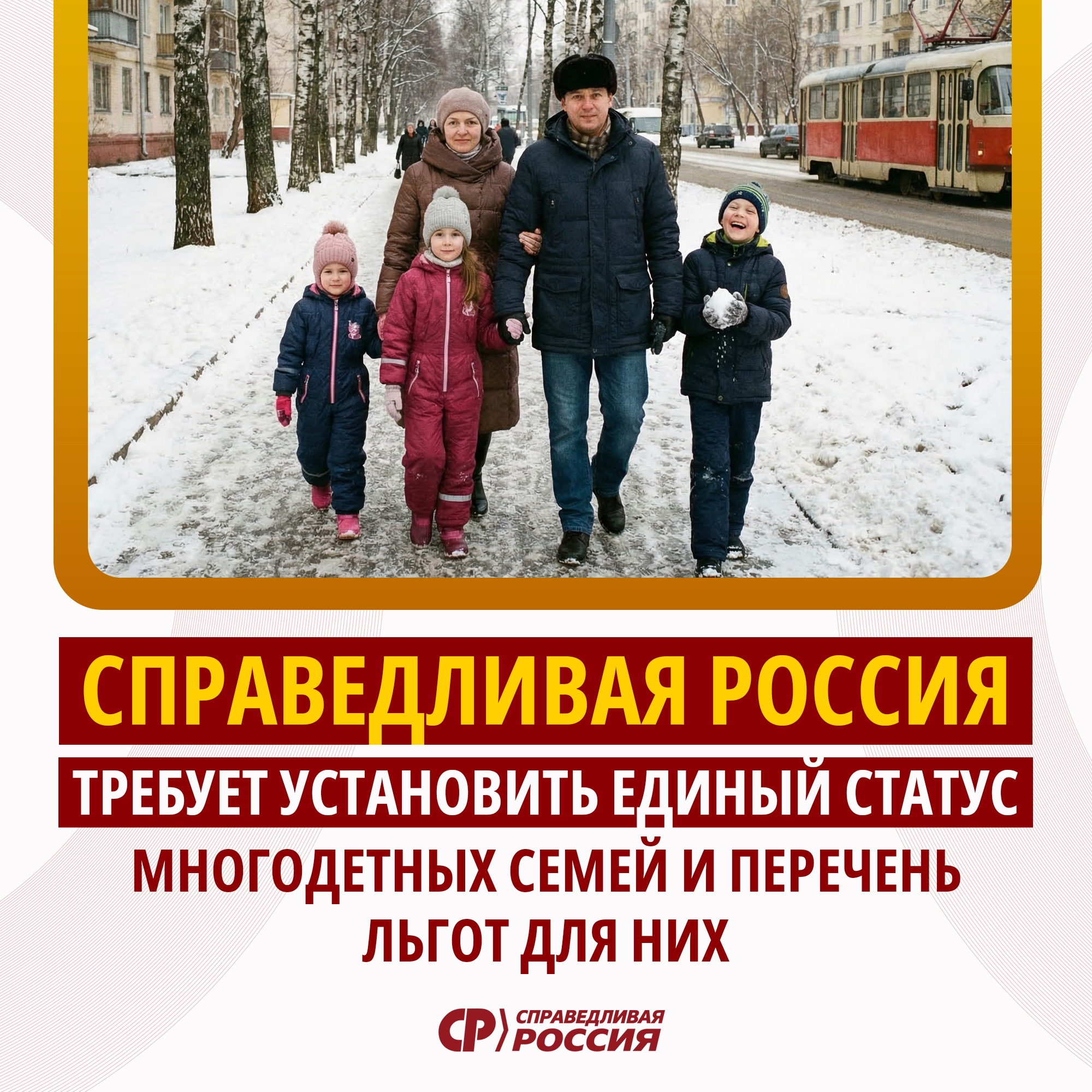 Партия СПРАВЕДЛИВАЯ РОССИЯ выступила с инициативой закрепить единый правовой статус многодетных семей и определить для них конкретный набор льгот. Соответствующий законопроект был внесён в Госдуму РФ председателем партии Сергеем Мироновым.