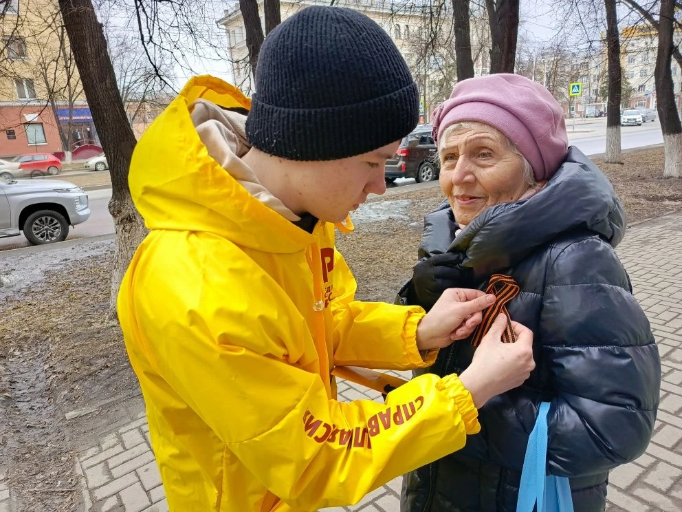 На улицах города волонтеры раздают всем желающим георгиевские ленточки, рассказывают о богатой истории этого символа, его истинном значении и правилах, как его носить.